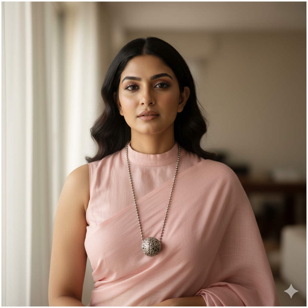 The pendant is strung on a classic beaded chain, adding texture and structure to the design while keeping the focus on the ornate centrepiece. Perfect for pairing with cotton sarees, handloom outfits, or earthy Indo-western looks, this statement piece is ideal for those who love rustic, heritage-inspired jewellery with a bold twist.